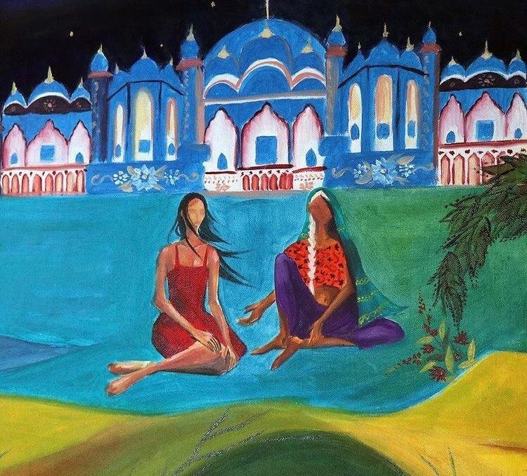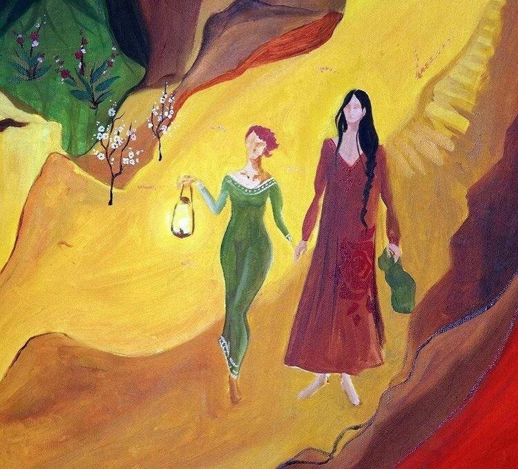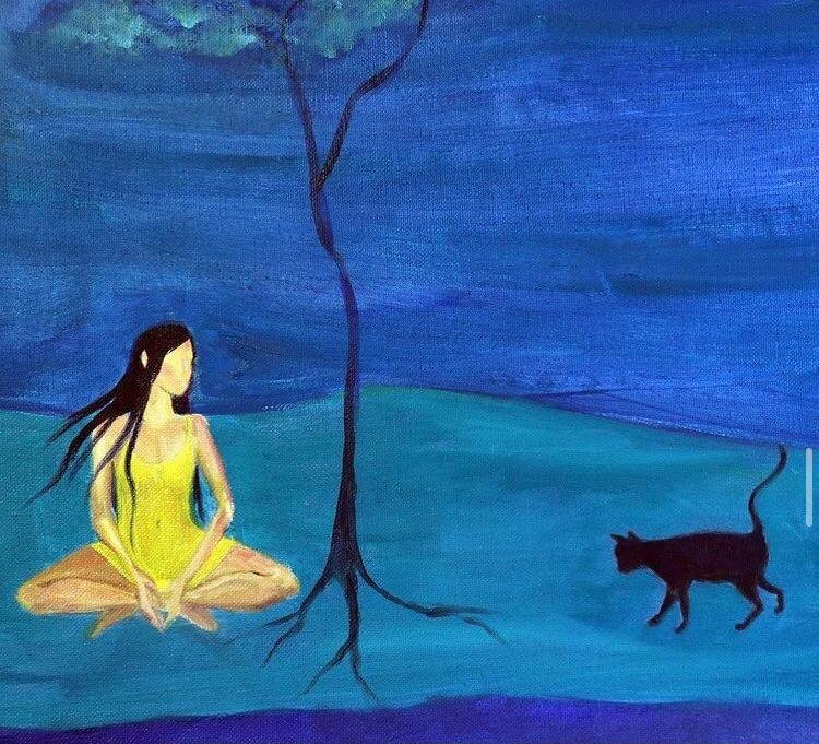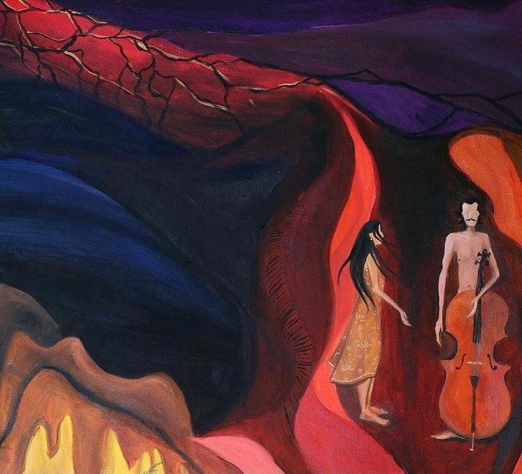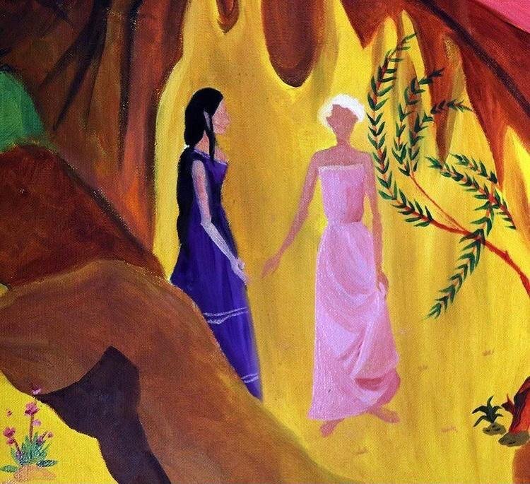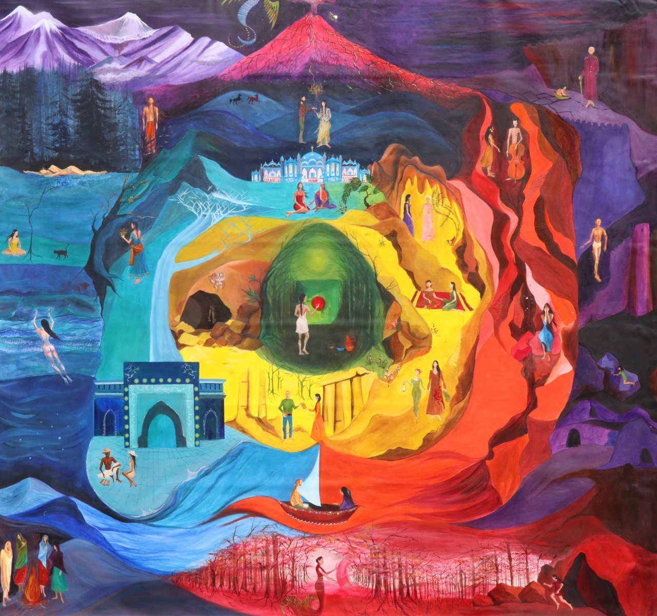 Spiral of Life (200 × 200 cm) is the central work of my master’s thesis in painting. It is a visual journey into transformation and identity, unfolding along a spiral path. The spiral begins at the top, where a volcanic mountain holds the egg of a phoenix, and moves inward through shifting landscapes—ocean, jungle, desert, and ancient monuments—inhabited by animals and figures that symbolize guides, friends, and teachers.